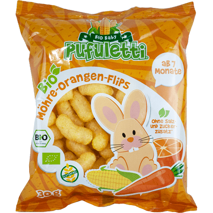 Βιολογικό σιμιγδάλι καλαμποκιού79,5%,βιολογικό κραμβέλαιο.βιολογική σκόνη καρότου 6%βιολογική σκόνη πορτοκαλιού 2%,βιταμίνη Β1