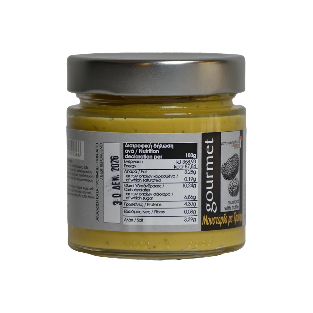 Η μουστάρδα αν και δεν θεωρείται απαραίτητη για τα φαγήτα μας, μόλις προστεθεί δίνει μια ιδιαίτερη και κάπως πικάντικη γεύση… Για σκεφτείτε να έχετε στο ράφι της κουζίνας σας σπιτική μουστάρδα με Μαύρη Τρούφα!!! Περιέχει μουστάρδα (νερό, σιναπόσπορο, ξύδι, ζάχαρη, αλάτι, σταθεροποιητή, κουρκουμά και αρώματα) και μαύρη καλοκαιρινή Τρούφα!