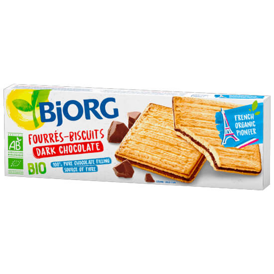 Βιολογικά γεμιστά μπισκότα με πραγματική μαύρη σοκολάτα, καθαρό βούτυρο κακάο και αλεύρι ολικής. Πλούσιο σε φυτικές ίνες. Χωρίς φοινικέλαιο. Περιέχει 3 ατομικές συσκευασίες των 2 μπισκότων, για ένα νόστιμο τραγανό σοκολατένιο σνακ.