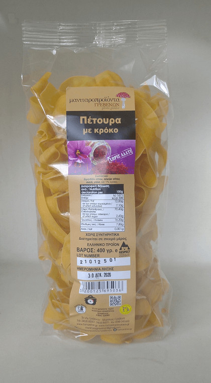 Σπιτικά ζυμαρικά με φρέσκα αυγά, φρέσκο γάλα και 100% άλευρα και σιτηρά από τα Γρεβενά! Πέτουρα με Κρόκο!!! Ο Κρόκος, ή αλλιώς το ελληνικό σαφράν, χαρίζει στο φαγητό μας νοστιμιά, αλλά έχει και πολλές φαρμακευτικές ιδιότητες, χάρη σε δύο συστατικά, την πικροκροκίνη και την κροκίνη!!! Έτοιμα σε 3 – 4 λεπτάκια, ιδανικά με μία κόκκινη σάλτσα, λαχανικά ή και κρέας!!!