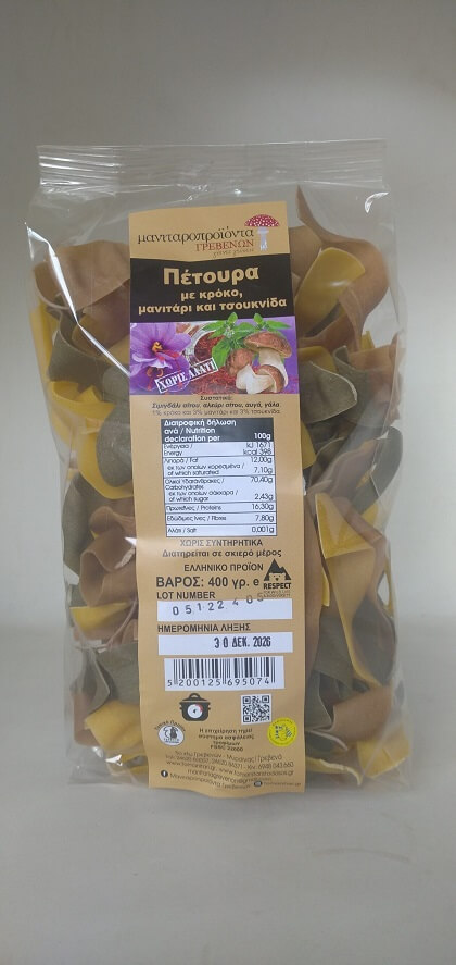 Σπιτικά ζυμαρικά με φρέσκα αυγά, φρέσκο γάλα και 100% άλευρα και σιτηρά από τα Γρεβενά! ‘Ενας ξεχωριστός συνδυασμός, πέτουρα με σκόνη Βασιλομανίταρο, Κρόκο και Τσουκνίδα!!! Ο Κρόκος, ή αλλιώς το ελληνικό σαφράν, χαρίζει στο φαγητό μας νοστιμιά, αλλά έχει και πολλές φαρμακευτικές ιδιότητες, χάρη σε δύο συστατικά, την πικροκροκίνη και την κροκίνη!!! Παράλληλα, η τσουκνίδα είναι πλούσια σε βιταμίνες, ασβέστιο και έχει ισχυρή αντιοξειδωτική δράση Έτοιμα σε 3 – 4 λεπτάκια, ιδανικά με μία κόκκινη σάλτσα, λαχανικά ή και κρέας!!!
