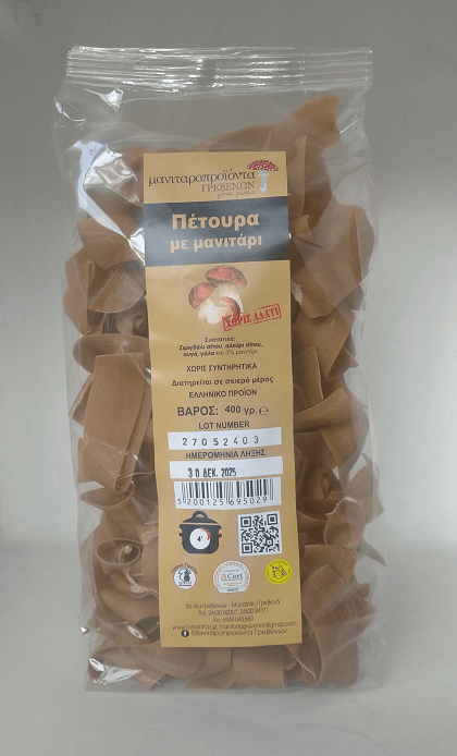 Σπιτικά ζυμαρικά με φρέσκα αυγά, φρέσκο γάλα και 100% άλευρα και σιτηρά από τα Γρεβενά! Από την παράδοση σε πιο μανιταρένιες γεύσεις, πέτουρα με σκόνη Βασιλομανίταρο!!! Έτοιμα σε 3 – 4 λεπτάκια, ιδανικά με μία κόκκινη σάλτσα, λαχανικά ή και κρέας!!!